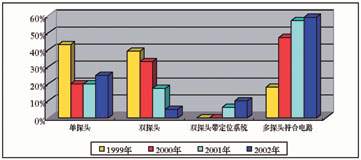 圖1 所示從1999年到2002年(2002年的數據是由上半年數據推算而來)單探頭、雙探頭、雙探頭帶定位系統和多探頭符合線路,四種不同核醫學設備每年各種類型所占比例?梢钥闯。最為明顯的是普通雙探頭在2002年僅僅占總數的5%,普通單探頭占總數25%,多探頭帶符合電路系統占總數59%。普通雙探頭帶X線定位系統占總數10%?梢钥闯鰡翁筋^SPECT和多探頭符合電路系統呈增長趨勢,尤其以多探頭符合電路系統更為明顯。