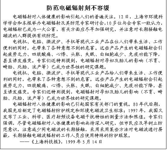 在您看電視的時(shí)候,您也許不會料到比高壓電纜所產(chǎn)生的電磁波還要強(qiáng)的電磁輻射正籠罩著您;在您用移動電話談妥一宗生意的時(shí)候,您不會想到手機(jī)天線集中釋放的電磁波已經(jīng)進(jìn)入了您的體內(nèi)……