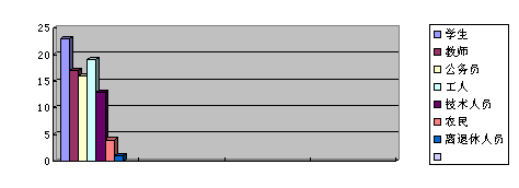 調(diào)查共收回問卷 93 份,回收率為 93% 。在被調(diào)查人群中,男性 48 人,女性 45 人(圖 1 ),其中有 37 人的日常生活中與電磁波有直接的聯(lián)系,其余 56 人都不同程度的接觸電磁波(圖 2 )。在被調(diào)查的人群中,有 23 名學(xué)生, 17 名教師, 16 名公務(wù)員, 19 名工人,技術(shù)人員 13 名,農(nóng)民 4 名,離(退)休人員 1 名。